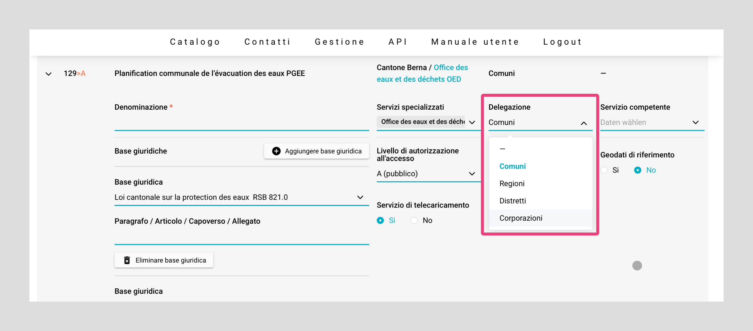 ℹ️ Una delega a un comune, a una regione, a un distretto o a un'azienda ha effetto solo sui cataloghi già esistenti. Se un comune e il suo catalogo non sono ancora stati creati, è possibile farlo tramite l'amministratore (admin@geobasisdaten.ch): le voci che sono già state delegate vengono create retroattivamente in questo nuovo catalogo!