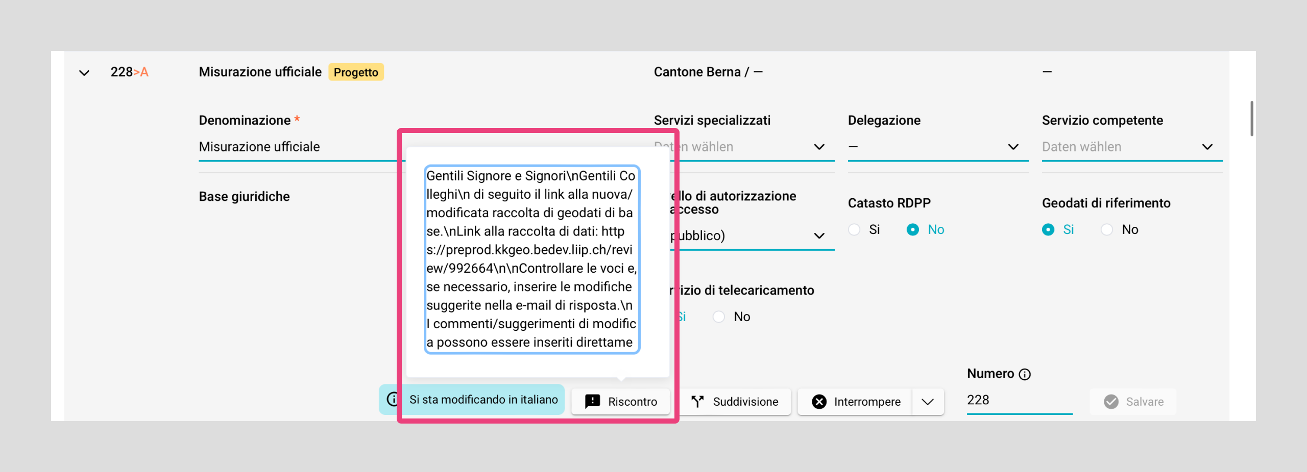 Nella maschera di modifica, cliccando sul pulsante Riscontro un testo predefinito viene copiato negli appunti e può essere inviato via email. Il testo contiene un link che permette di visualizzare la voce ad utenti esterni sprovvisti di conto utente.