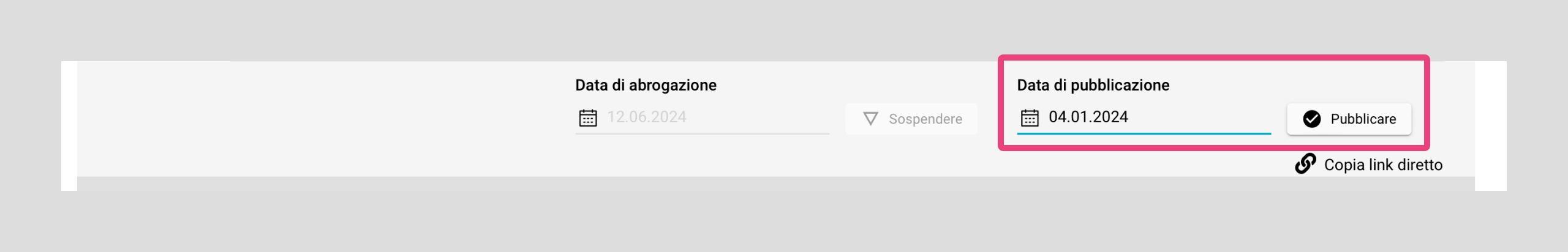 Una voce modificata diventa accessibile al pubblico solo quando è stata pubblicata. È possibile definire una data per la pubblicazione (Data di pubblicazione): le modifiche della voce sono visibili nell'applicazione a partire da tale data. Una pubblicazione non può essere annullata e deve quindi essere valutata attentamente.